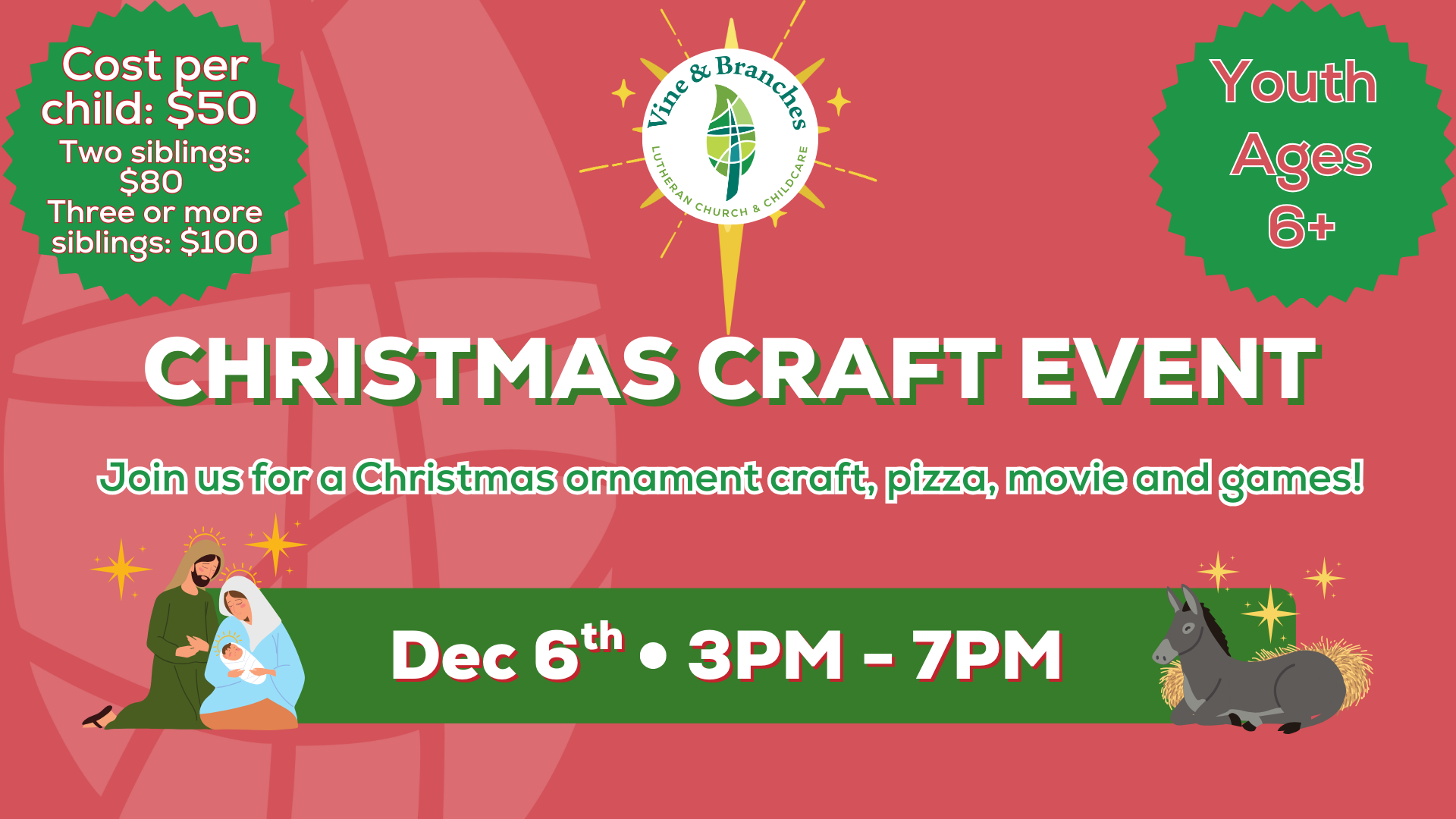 Join us for a Christmas ornament craft, pizza, movie and games!